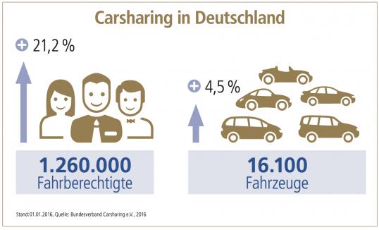 Carsharing wird in Deutschland immer beliebter. Einer Datenerhebung des Bundesverbandes Carsharing e.V. zufolge ist die Zahl der registrierten Nutzer in Deutschland Anfang 2016 mit einem Zuwachs von 22,1 Prozent im Vergleich zum Vorjahr auf 1,26 Millionen angestiegen. Insgesamt stehen bundesweit rund 16.100 Fahrzeuge von circa 150 verschiedenen Anbietern zur Nutzung bereit.