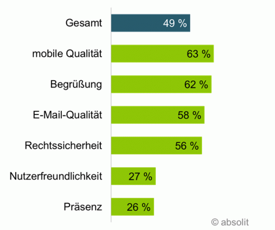 Dass 53 Prozent einen Newsletter anbieten, ist kein Anlass zur Freude: Bei über der Hälfte sind die Empfänger frustriert. Auch nach drei Monaten des Wartens haben 55 Prozent der Energieversorger noch keinen Newsletter verschickt. Die Scheu der EVUs ist vielleicht auch ganz gut so: 26 Prozent vergessen bei der Einwilligung die juristisch geforderte Bestätigung der Einwilligung (Double-Opt-in). Zum Vergleich: Im Handel arbeiten 97 Prozent der Unternehmen mit Double-Opt-in. Bei allen untersuchten EVUs konnten Mängel bei der Rechtssicherheit nachgewiesen werden.